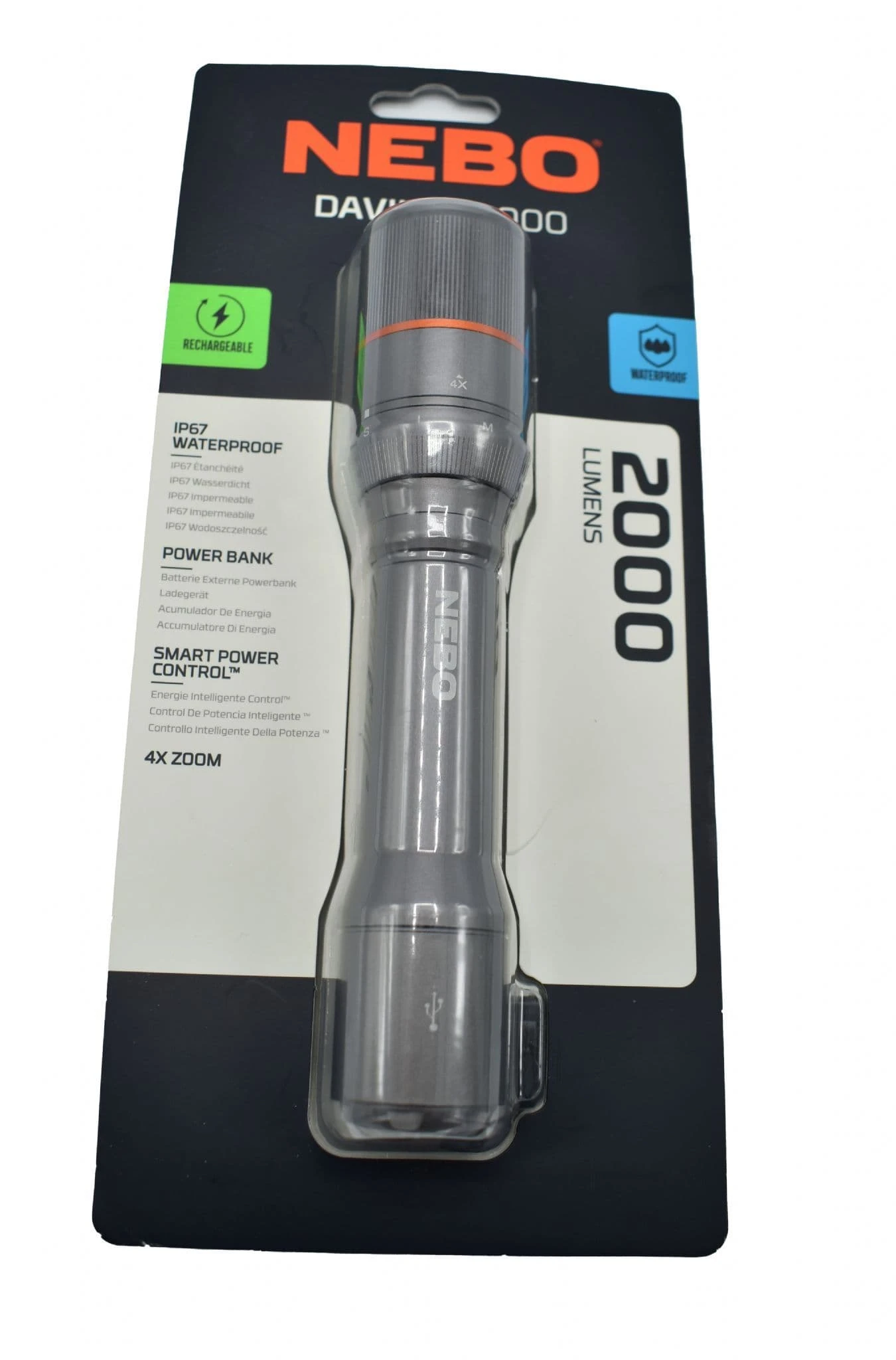 The Nebo Davinci 2000 Lumen Rechargeable Flashlight is a must have accessory for any camping trip, festival or outdoor adventure. Featuring four different modes including high with a maximum of 2000 lumens to strobe for any emergency situation, this handy flashlight will provide you with the perfect amount of light for any task you are doing. This torch from Nebo has been constructed from strong and durable aircraft grade aluminium, which not only makes it ideal for outdoor use but also means it is waterproof up to 1 meter for 30 mins, so you can use it whatever the weather!